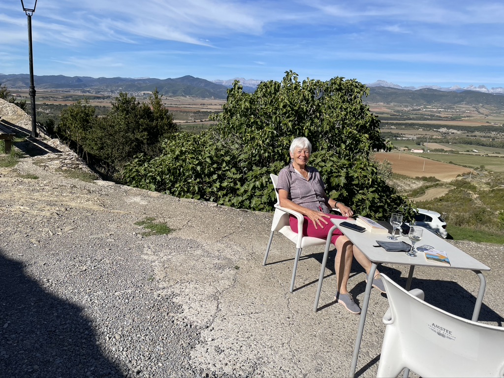 Da wir schon zur Mittagszeit in Arrés ankommen, ist die Herberge noch geschlossen. So wandern wir hinauf zur Bar. Wir stellen einen Tisch der Bar auf ein kleines Plateau in die Sonne, holen uns Essen und Trinken in der Bar und genießen die Ruhe und die herrliche Aussicht über das unter uns liegende Tal und die Pyrenäen in der Ferne.