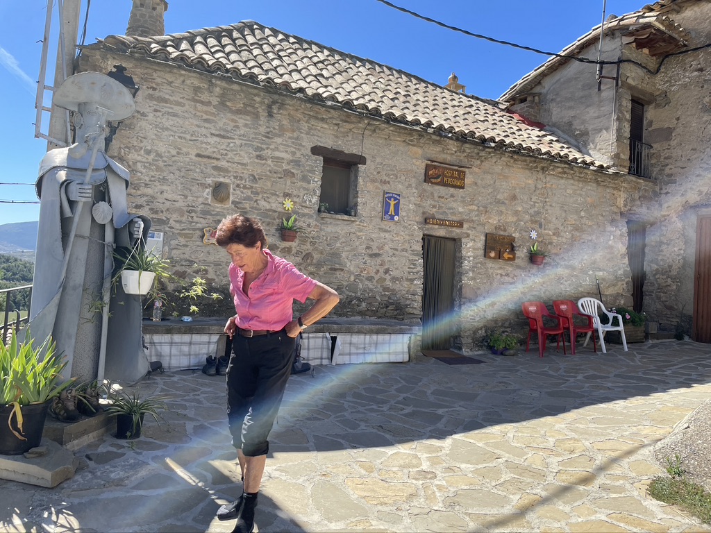 Nach und nach treffen weitere Pilger ein. So sind wir dann beim leckeren Abendessen fünf deutsche Pilger, ein Franzose, ein italienischer und ein spanischer Hospitalero. Es entwickelte sich in interessantes Gespräch mit einem Sprachengemisch aus deutsch, spanisch und französisch. Neben den üblichen Gesprächen über den Weg wird auch über die Geschichte Spaniens und über die Wunden, die der spanische Bürgerkrieg 1936-39 hinterlassen hat und die auch heute noch nachwirken. So wird auch in Spanien – wie auch in Deutschland nach dem 2. Weltkrieg – ein wenig der Mantel des Schweigens über diese Zeit gelegt. Das gemütliche Beisammensein und die interessanten Gespräche in einer Herberge, das ist die Situation, die den Jakobsweg auch zu etwas Besonderem machen. Hier in Arrés haben wir sie gefunden. (Leider läuft es nicht in jeder Herberge so.) Anscheinend strömt diese Herberge eine besondere Atmosphäre aus, denn in den Forem finde ich aus 2023 u.a. folgende Bemerkung: